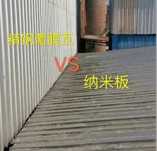 上图是91短视频推广软件覆膜瓦和纳米板使用半年后的对比,如图所示:91短视频推广软件覆膜瓦完好如初,但是纳米板表面已经开始脱皮、生锈和腐蚀。