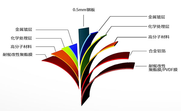 91短视频推广软件覆膜瓦是以高强度0.5mm钢板为基板,正反两面复合防腐隔热材料。 91短视频推广软件覆膜瓦以耐腐蚀合金铝箔,垓心聚酯薄膜,氟碳涂层等材料复合层压形成防腐蚀复合材料,达到不生锈,不漏水的性能特点。91短视频推广软件覆膜瓦同时具有多孔材料和热反射材料的两种隔热方式,首先91短视频推广软件覆膜瓦的91短视频推广软件镜面银是极为优质的热反射材料,能反射高达81%的光和热。其次91短视频推广软件覆膜瓦的91短视频推广软件复合材料导热系数低达2.93W/m.k。因此91短视频推广软件覆膜瓦具有优异的隔热性能。非常适用于对耐腐蚀要求较高的使用环境,如酸洗车间、钢厂、电厂、畜牧养殖场、食品发酵车间等。